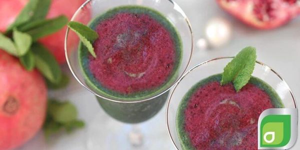 First, pour the green blend into glasses. Then slowly pour the pomegranate berry mixture into the middle of each glass. Garnish with fresh mint leaves and enjoy!